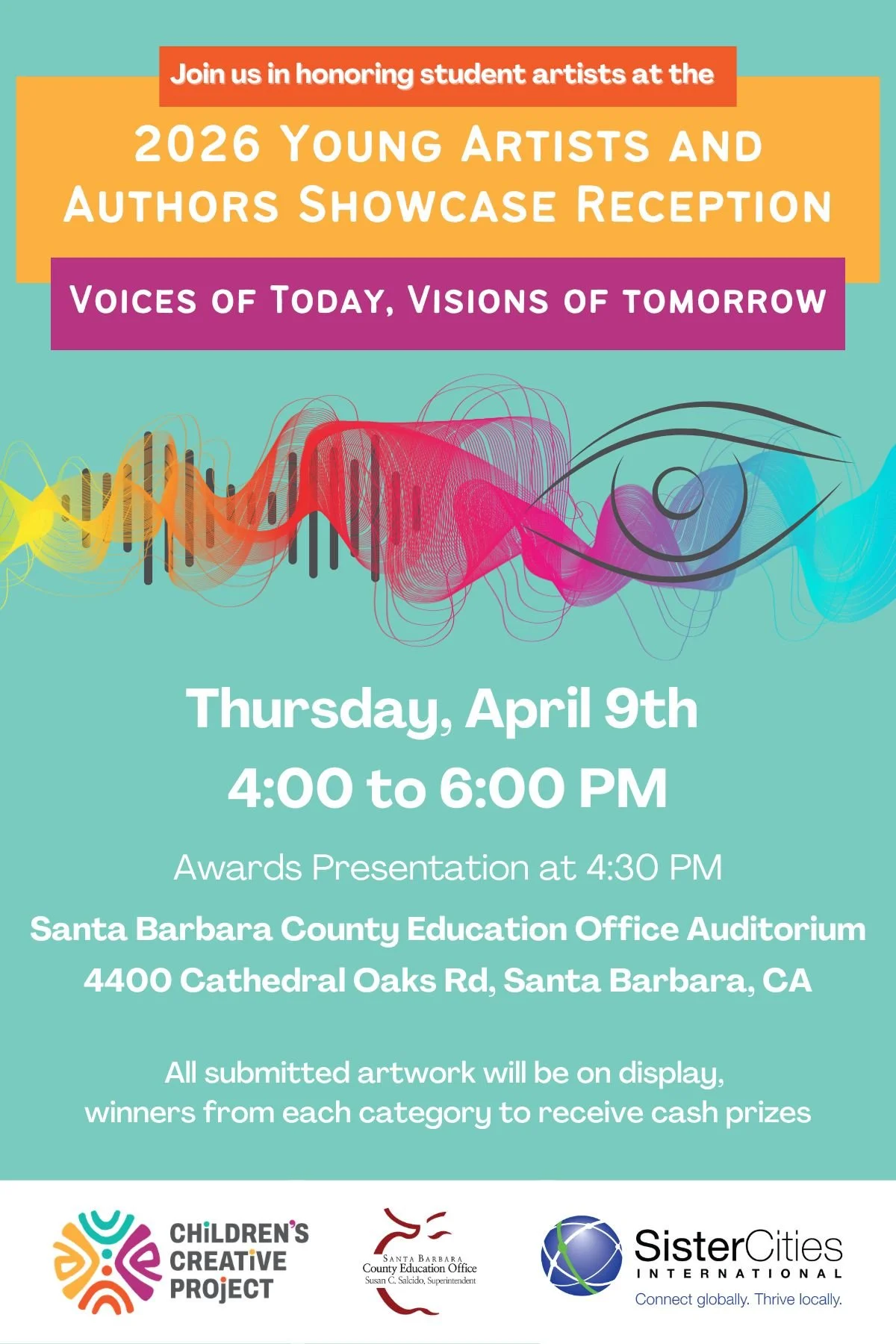 In recent years, CCP has partnered with the Santa Barbara Sister Cities Advisory Board to produce an arts competition for local secondary students, following the Sister Cities International guidelines for the Young Artists and Authors Showcase. We also have an ongoing collaboration with South Coast Kids Create to exhibit more than 250 artworks created by elementary students across 30 schools in South Santa Barbara County.